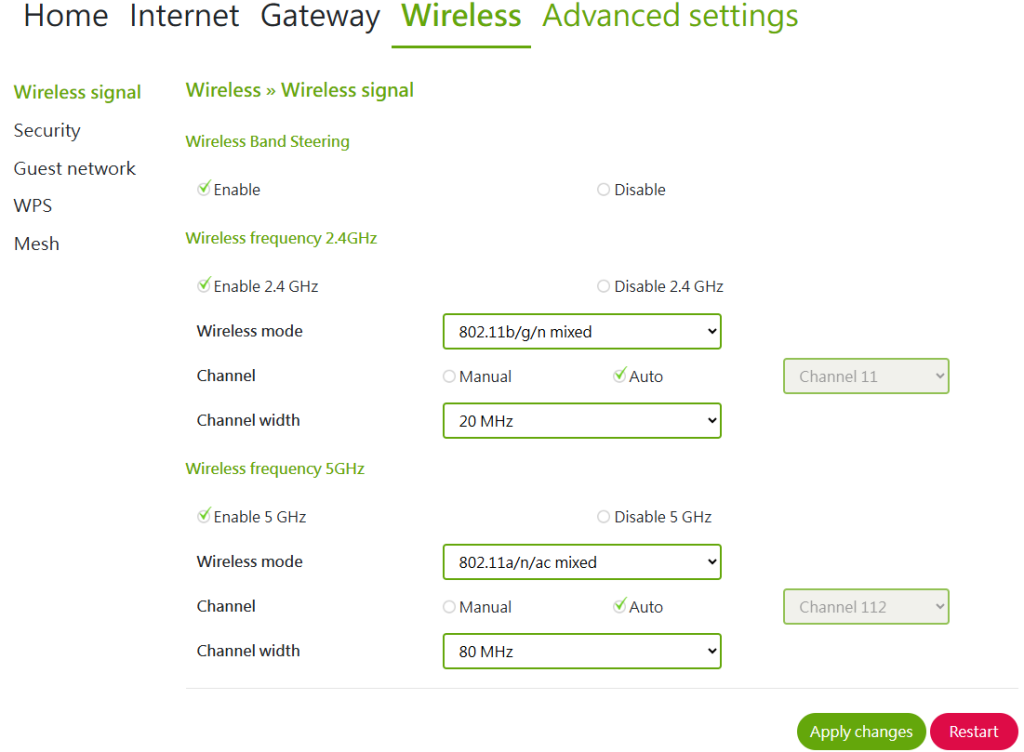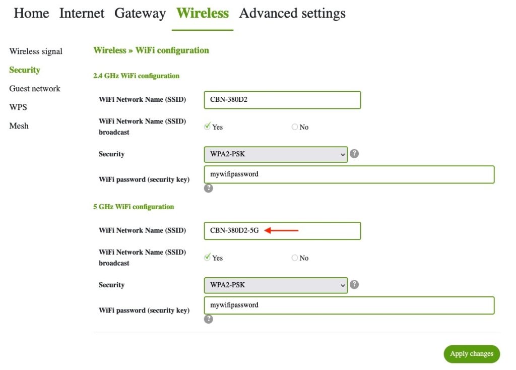 Under 5 GHz WiFi configuration, add “-5G” onto the end of your 5g network name. This way, when you attempt to connect to your Wi-Fi, you will have two networks to choose from. In the example above, you would then see CBN-380D2 and CBN-380D2-5G when connecting to Wi-Fi. You can leave the password the same for both networks, or change it for one or both, it’s up to you.